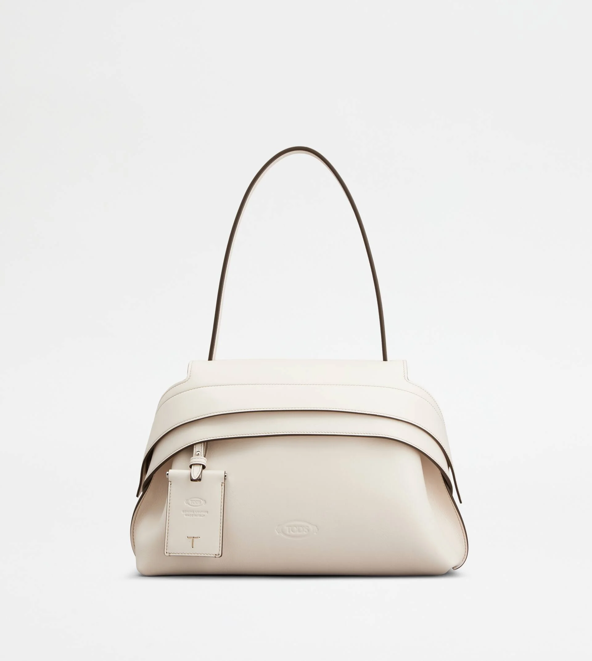 The iconic Tod's Wave Bag reinterpreted in a contemporary design with flowing and sophisticated lines. Crafted in soft calfskin leather, it comes with a practical concealed zip under the front strap, which can be fixed on the sides with snap buttons. The handle, thin and flat, ensures comfortable shoulder-wearing. A removable mirror and a pocket on the back, with Tod's monogram engraved at the center, complement the style. - Dimensions: L 13 ins x H 8.3 ins x D 4.3 ins - Handle: height (drop) 8.7 ins - Made in Italy - Bag in leather - Item crafted in calfskin leather - Tod's logo stamped on the front - Removable mirror - Back pocket with embroidered T - Zip closure - Internal zipped pocket - Maintenance and care cards included - Branded dustbag