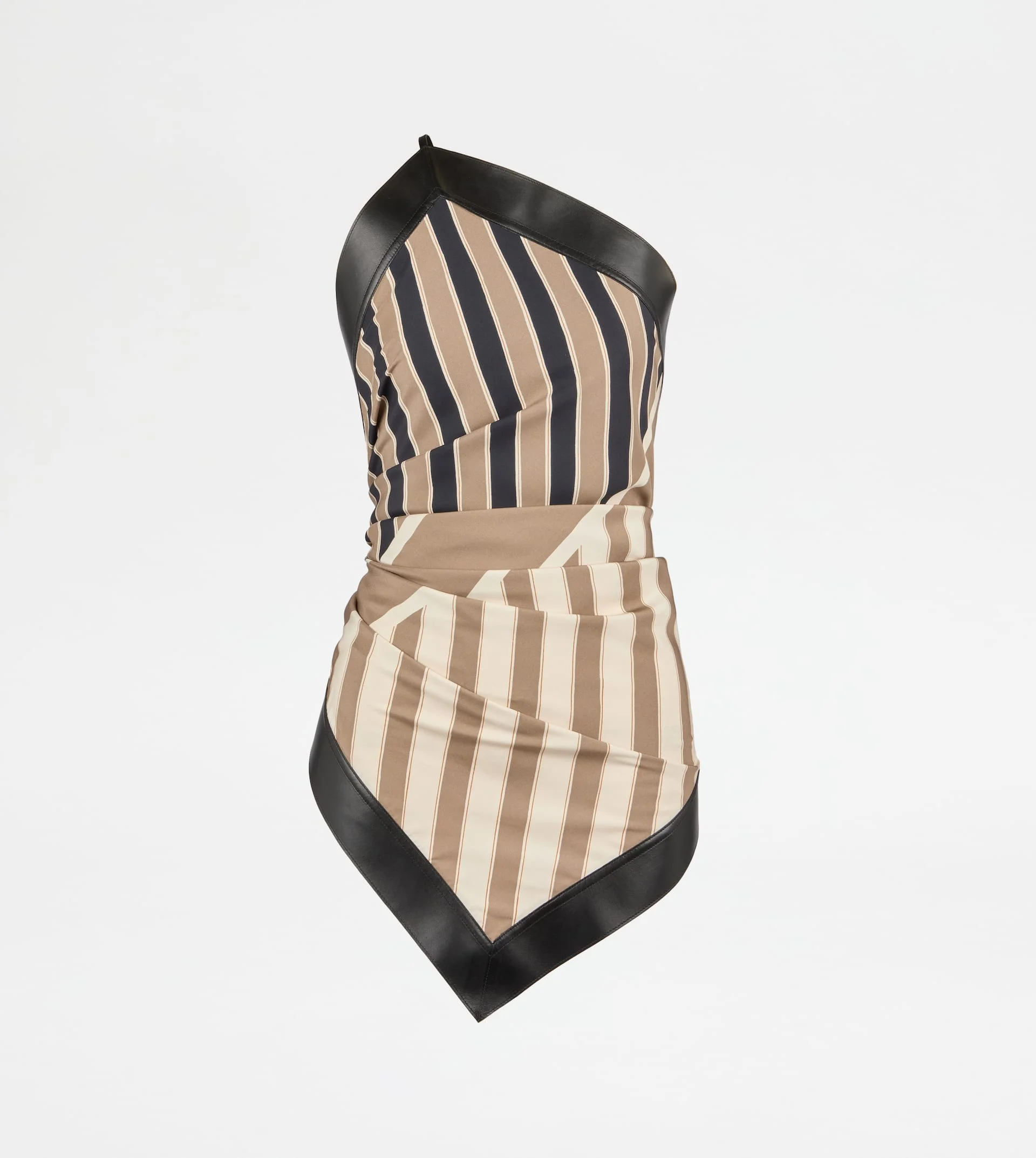 Single-sleeved foulard-top in printed silk with striped pattern and soft nappa leather hems. It can be tied at the back, this asymmetrical style interprets a sophisticated elegance. - Fitting: regular - The female model is 5' 9'' and wears size S (IT) - Item composition: 100% silk, lambskin leather inserts - Made in Italy