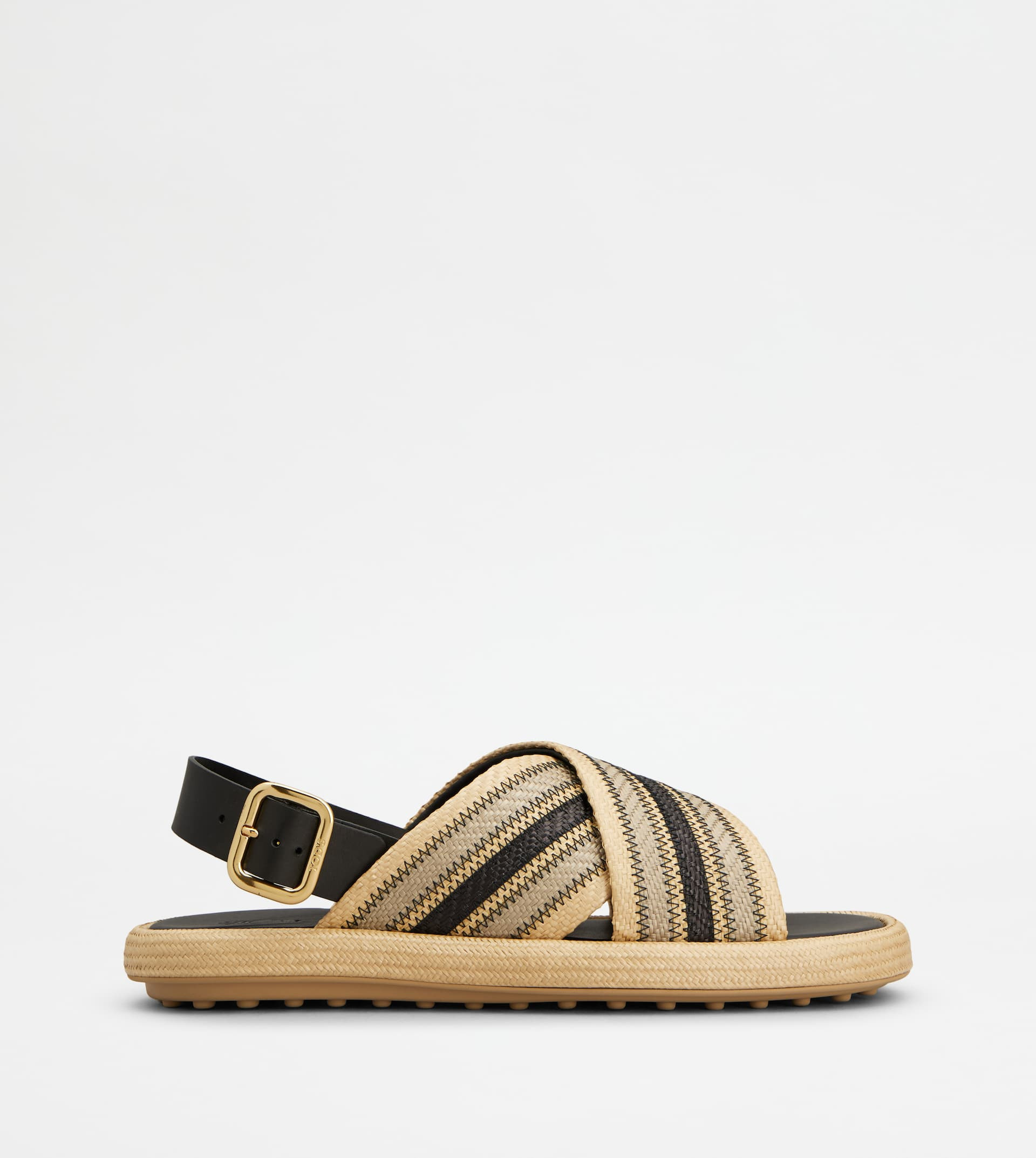 Sandals in raffia effect fabric with striped detailing. Characterized by crossed bands, they feature a leather heel strap with branded buckle. Featuring a rubber outsole with embossed rubber pebbles, they interpret an easy and sophisticated style at once. - Made in Italy - Women's Tod's crossed sandals - Polyamide upper - Leather heel strap - Branded metal buckle - Leather lining and insole - Raffia effect outsole profile - Rubber outsole with embossed rubber pebbles - Maintenance and care cards included - Branded dustbag