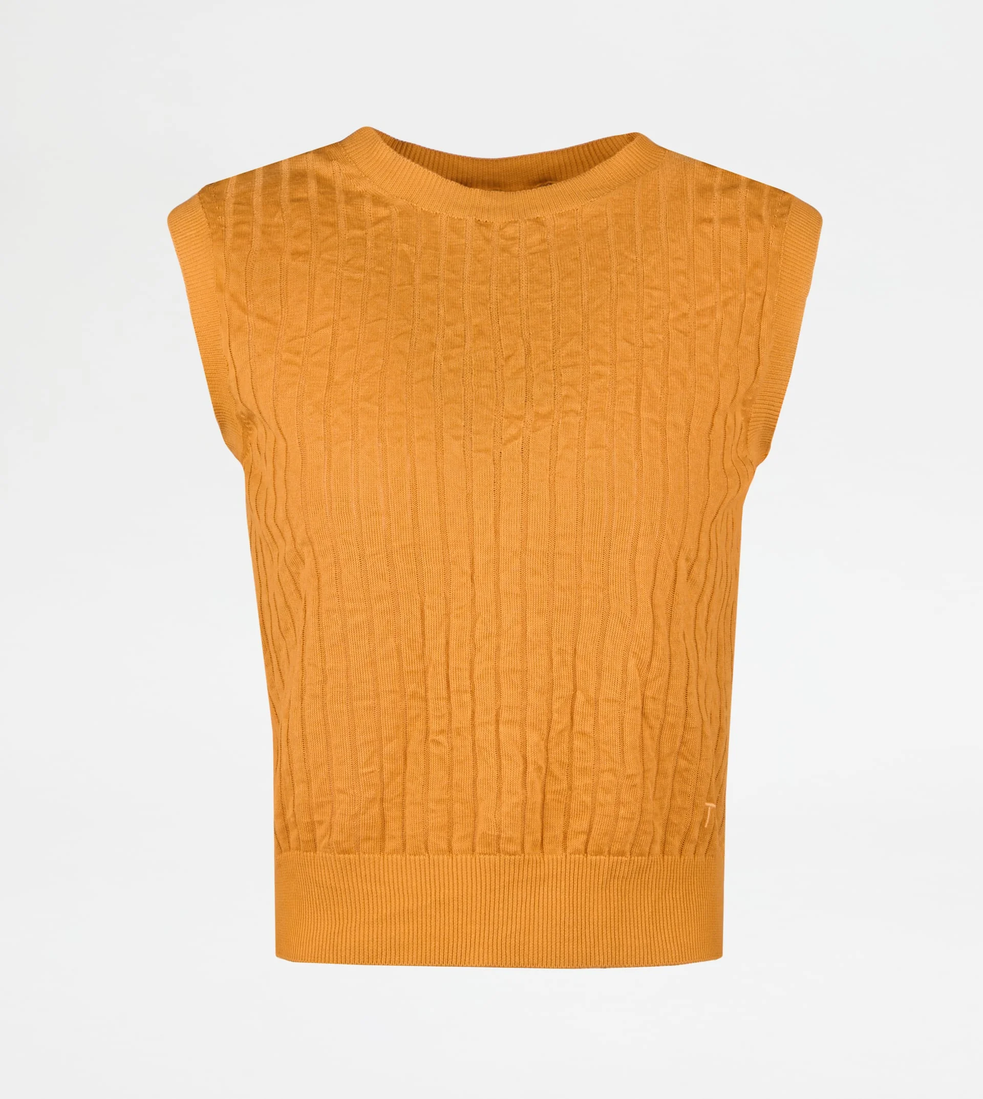 Round-neck vest in cotton blend knit with crumpled ribbed detailing. A style enriched by the Tod's monogram embroidered on the bottom. A versatile and refined garment for your contemporary everyday look. - Made in Italy - Vest in knit - Fitting: slim - The model is 5' 9'' and wears size S (IT) - Item composition: 69% cotton, 23% elastomultiester, 7% polyamide, 1% elastane - Maintenance and care cards included