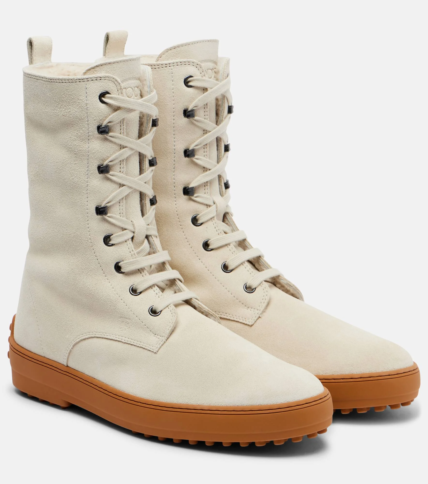 The Winter Gommino boots from Tod's are your answer to cold-weather days. Made from smooth suede with lace-up fronts, they feature plush shearling lining and pebble detailing at the heel. Product Details - Upper: calf leather (suede) - Lining: shearling - Sole: shearling insole, rubber sole - Toe shape: round toe - Made in Italy - Includes: shoe box, dust bag - Designer color name: Bianco Latte - Item color: white - Closure: lace-up - Item number: P01113234 Size & Fit - True to size - European sizes - 3cm-1" platform (size EU 38) - 4cm-1.5" wedge heel (size EU 38)