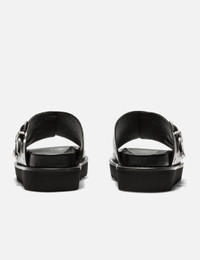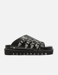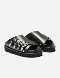 - Toga Pulla - 4 Metal Buckle Sandals - Slip-on - Smooth leather upper - Quadruple buckles - Deep cupped footbed - Leather insole - Shark rubber outsole - Color: Black - Material: Leather, Synthetic Rubber - See more Sandals and Shoes