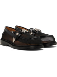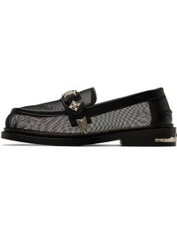 Sheer mesh and buffed leather loafers in black. · Moc toe · Strap with graphic hardware at vamp · Pinched seam at heel counter · Serrated edge at welt · Plaque at heel · Stacked leather heel with rubber injection · Leather sole Supplier color: Black Upper: textile, leather. Sole: leather, rubber. Made in Portugal 251492F121014