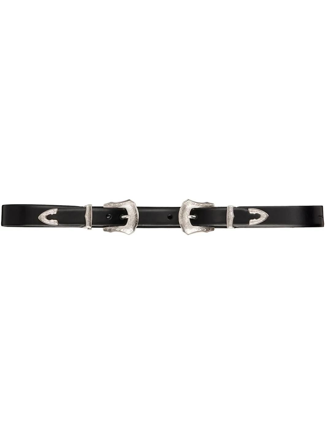 Buffed leather belt. · Hardware at ends · Post-stud fastening at back face · Twin pin-buckle fastening · Engraved silver-tone hardware · W1" Supplier color: Black Leather. Made in Japan 252492F001001