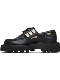 Buffed leather boat shoes. · Moc toe · Graphic hardware at lace-up closure · Cord with O-rings at sides · Pinched seam at heel counter · Topstitching at welt · Foam rubber midsole · Treaded rubber sole Supplier color: Black Upper: leather. Sole: rubber. Made in Portugal 252492F120000