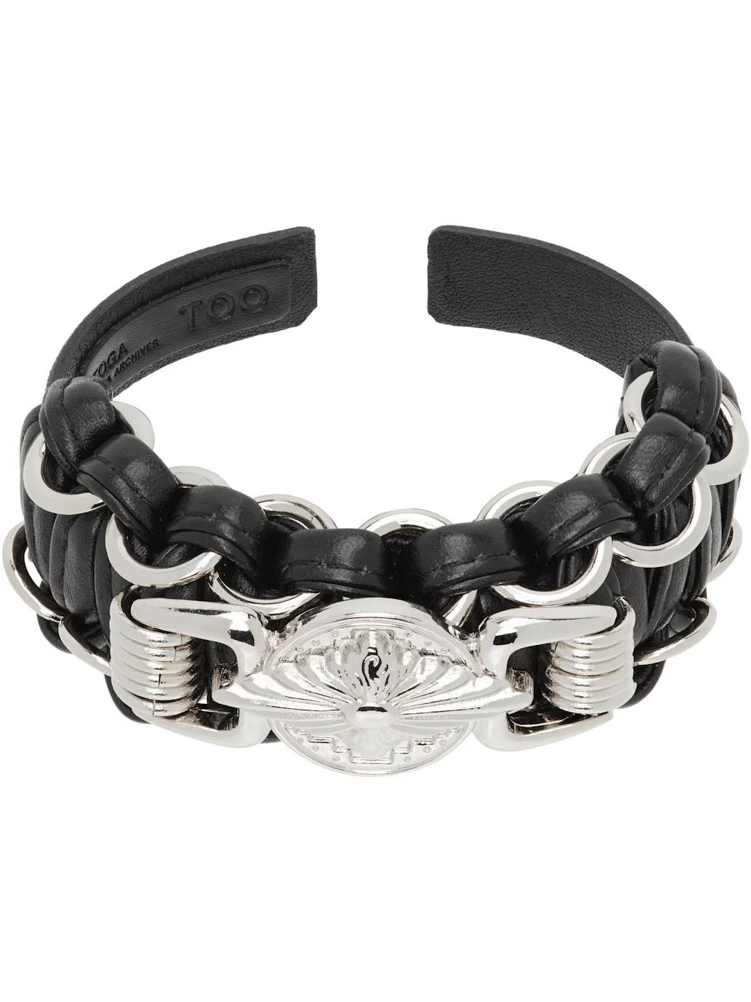 Open cuff braided leather bracelet in black. · Engraved graphic hardware at face · O-rings at length · Silver-tone hardware · D2.75" Supplier color: Black Leather. Made in Japan 252492F020002