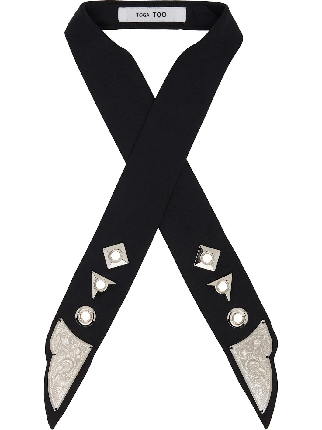 Satin tie. · Metal eyelets and graphic hardware at ends · Silver-tone hardware · W2" Supplier color: Black 100% polyester. Made in Japan 261492F029003