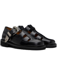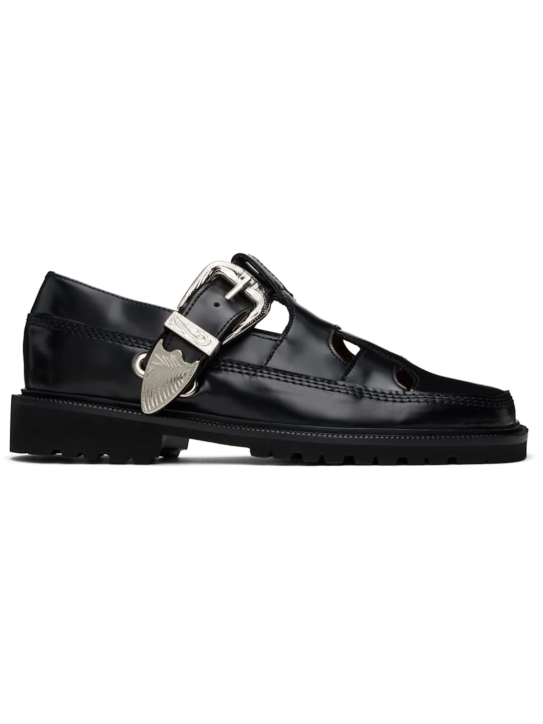 Polished leather loafers in black. · Moc square toe · Cutouts and pin-buckle strap at vamp · Buffed leather and suede lining · Treaded Vibram® rubber sole · Heel: H1.25" Supplier color: Black Upper: leather. Sole: rubber. Made in Portugal 251492F121001
