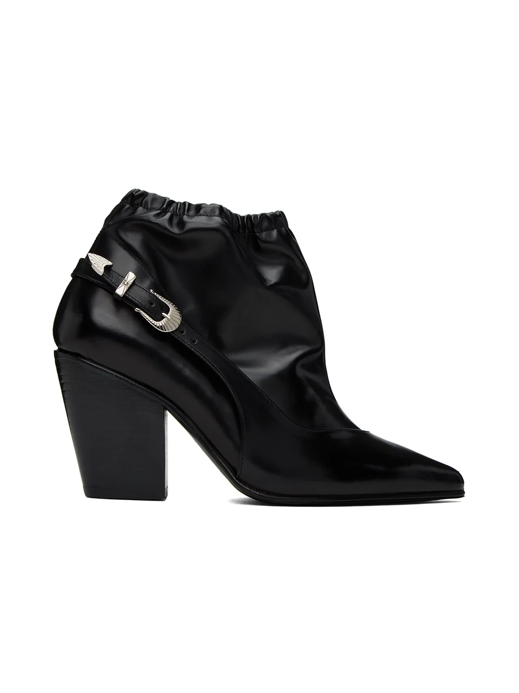 Ankle-high paneled polished leather boots in black. · Pointed toe · Gathering at elasticized collar · Signature hardware at pin-buckle slingback strap · Suede lining · Stacked leather heel with rubber injection · Leather sole · Silver-tone hardware · Heel: H3 in Supplier color: Black Leather. Made in Portugal 232492F113003