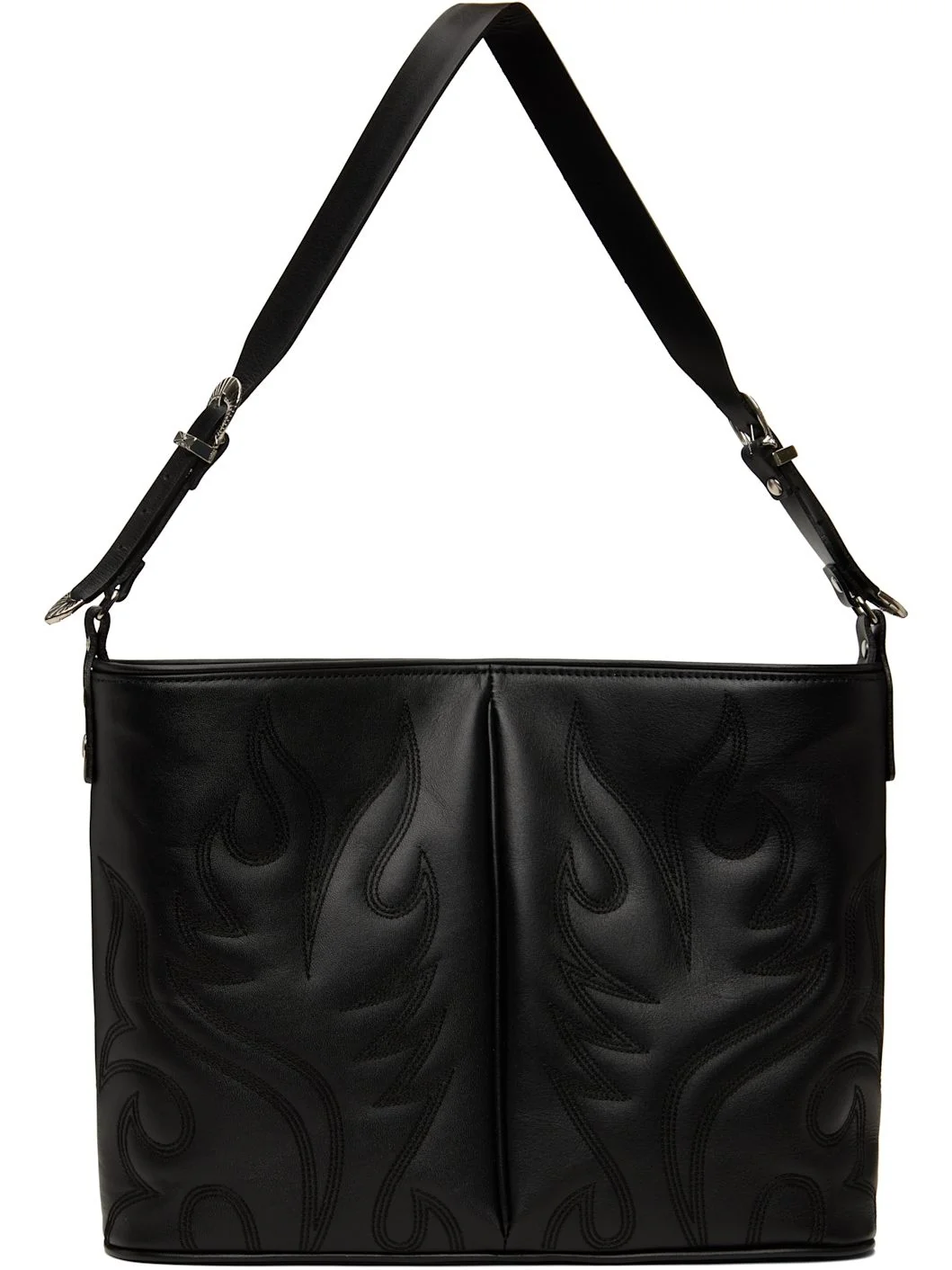 Buffed leather shoulder bag in black. · Graphic pattern embroidered throughout · Adjustable pin-buckle shoulder strap · Magnetic closure · Patch pocket at interior · Twill lining · H8.25" x W10.75" x D3.75" Supplier color: Black Body: 100% leather. Lining: 100% rayon. Made in Japan 251492F048002
