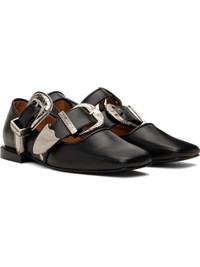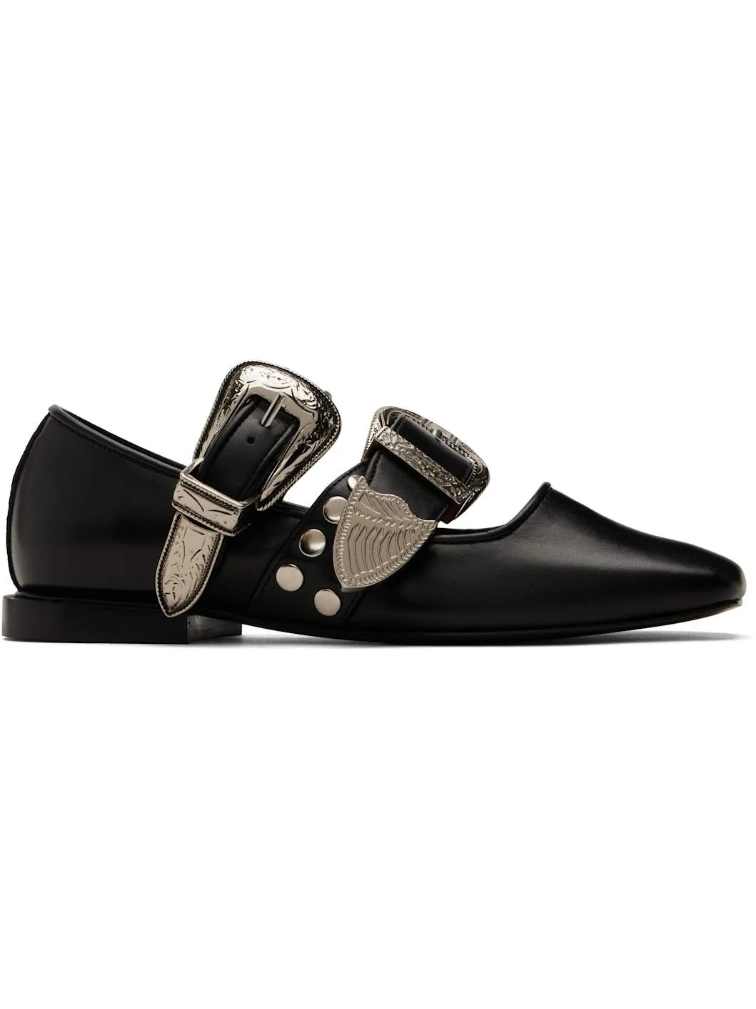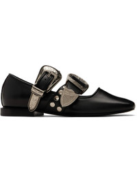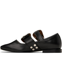 Buffed leather ballerina flats in black. · Square toe · Pin-buckle straps at vamp · Studs at sides · Logo-printed padded footbed · Buffed leather and suede lining · Stacked leather heel with rubber injection · Polished leather sole · Silver-tone hardware Available exclusively at SSENSE. Supplier color: Black Upper: leather. Sole: leather, rubber. Made in Portugal 251492F118009