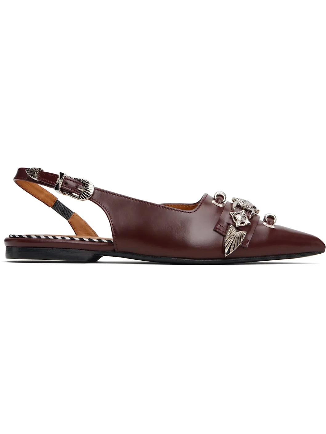 Buffed leather flats. · Pointed toe · Straps with graphic hardware at vamp · Elasticized pin-buckle slingback strap · Rubber heel · Leather sole Supplier color: Bordeaux Upper: leather. Sole: leather, rubber. Made in Portugal 252492F118005