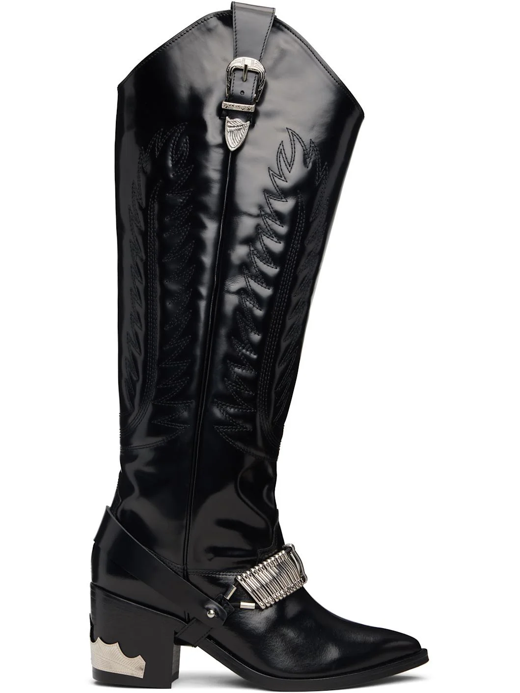 Knee-high buffed leather boots. · Pointed toe · Elasticized harness with hardware at vamp · Pull-loop and pin-buckle strap at collar · Engraved plaque at heel · Stacked leather heel with rubber injection · Leather sole · Heel: H2.5" Supplier color: Black Upper: leather. Sole: leather, rubber. Made in Portugal 252492F115000
