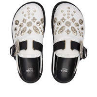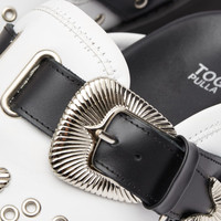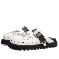 Step into the avant-garde world of Toga Pulla with these mules, where East meets West. Adorned with silver tone buckles and studs, they tap into the brand's Japanese roots and designer Yasuko Furuta’s love for americana inspired detailing. Made from smooth leather and sitting atop a chunky serrated sole, get ready to turn heads. - Leather Uppers - Adjustable Metal Buckle - Metal Studs - Rubber Outsole