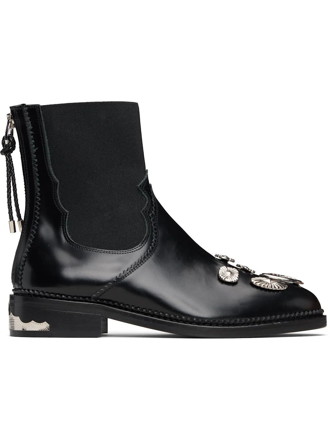 Ankle-high polished leather boots. · Serrated edges throughout · Pointed toe · Graphic hardware at vamp · Elasticized gusset at collar · Zip closure at heel · Topstitching at welt · Engraved plaque at heel · Stacked leather heel with rubber injection · Leather sole Supplier color: Black Upper: leather. Sole: leather, rubber. Made in Portugal 252492F113001