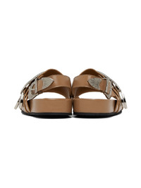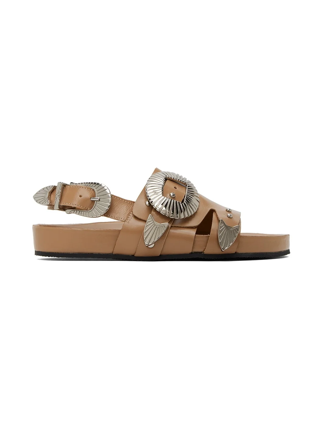 Buffed leather slip-on sandals in beige. Signature hardware throughout. · Open round toe · Post-stud fastening at vamp · Pin-buckle slingback strap · Logo stamp at molded leather footbed · Treaded rubber sole Wholesale exclusivity at SSENSE. Supplier color: Beige Upper: leather. Sole: rubber. Made in Portugal 232492F124019