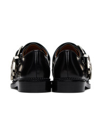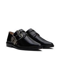 Polished leather oxfords in black. Signature hardware at vamp. · Pointed toe · Pin-buckle straps at vamp · Buffed leather and suede lining · Serrated detailing at welt · Stacked leather heel with rubber injection · Leather sole Wholesale exclusivity at SSENSE. Supplier color: Black