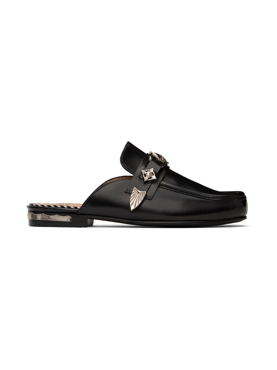 Polished leather slip-on loafers in black. Signature hardware at vamp and heel. · Square moc toe · Stacked heel · Leather outsole Available exclusively at SSENSE. Supplier color: Black