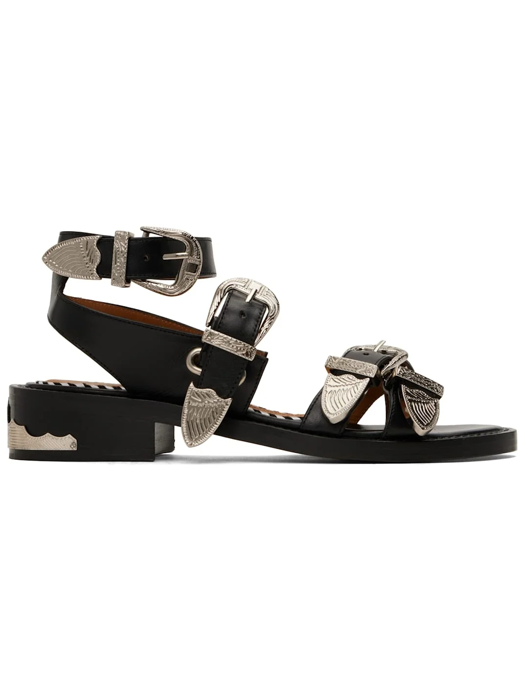 Buffed leather flat sandals in black. · Open toe · Crisscrossing pin-buckle straps at vamp · Wraparound pin-buckle ankle strap · Logo-printed padded footbed · Graphic hardware at stacked leather heel · Smooth leather sole with rubber injection · Silver-tone hardware · Heel: H1.25" Available exclusively at SSENSE. Supplier color: Black Upper: leather. Sole: leather, rubber. Made in Portugal 251492F124003
