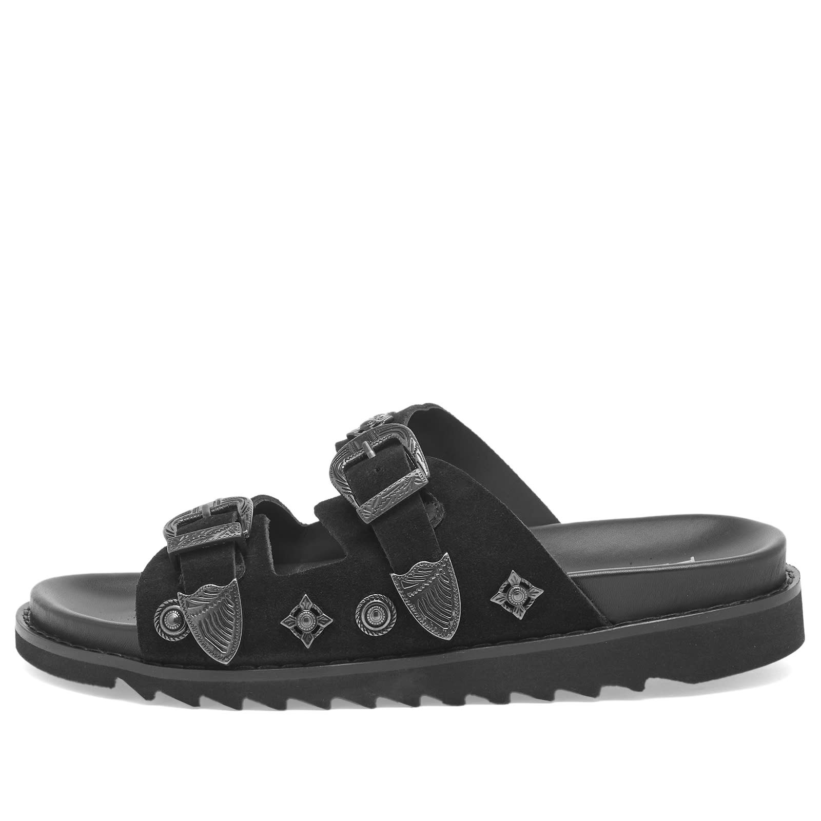 Step up your style with these Toga Pulla studded sliders. Exceptionally crafted from soft suede uppers and accented with the brand’s signature western-inspired hardware on the double strap design – it’s a shoe that will make sure you standout and make a statement. - Suede Upper - Metal Hardware - Buckle Straps