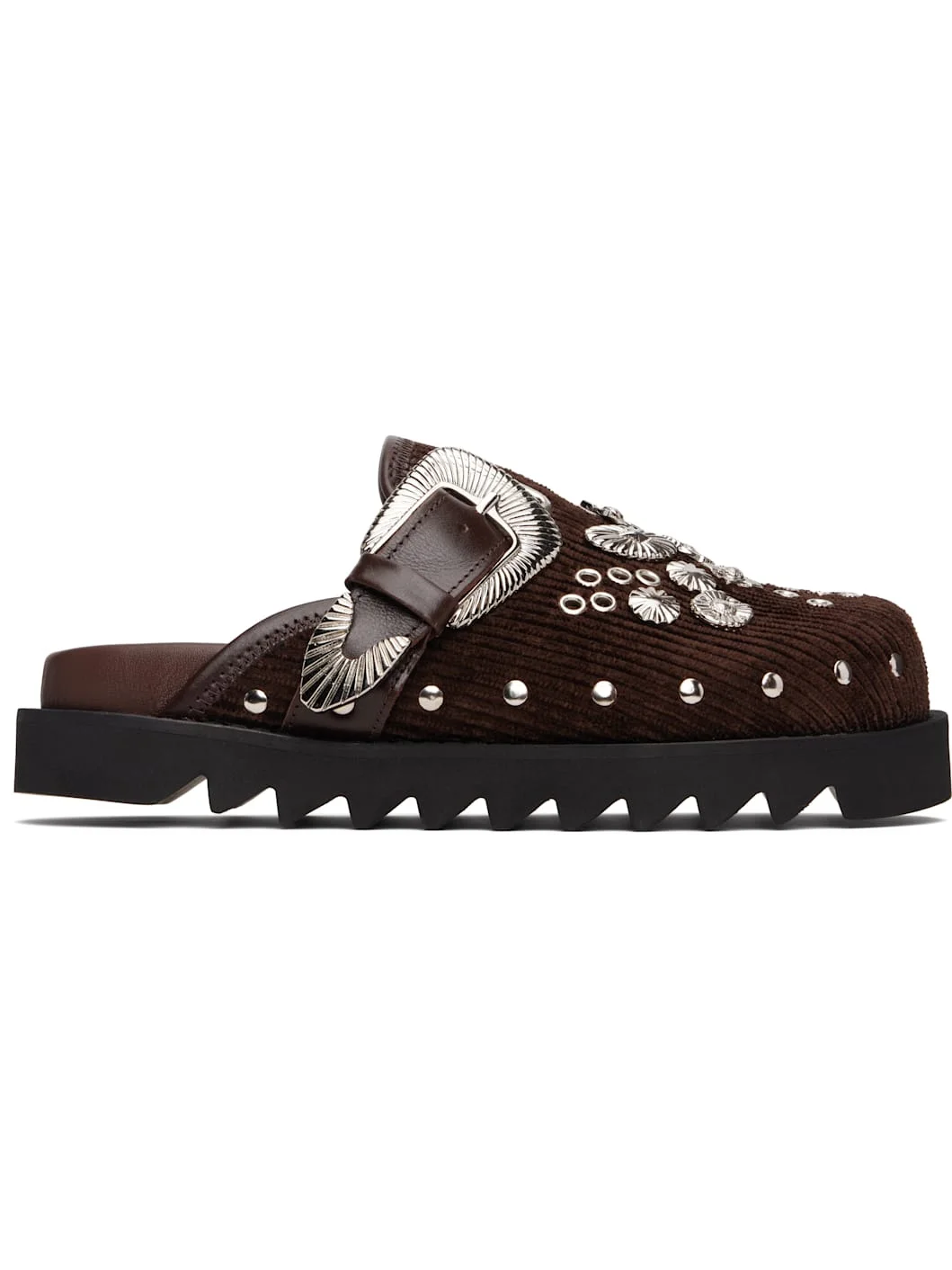 Corduroy slip-on loafers. · Studs throughout · Graphic hardware and metal eyelets at vamp · Pin-buckle strap at vamp · Mesh lining · Foam rubber midsole · Treaded rubber sole Available exclusively at SSENSE. Supplier color: Camel brown Upper: textile. Sole: rubber. Made in Portugal 252492F121020