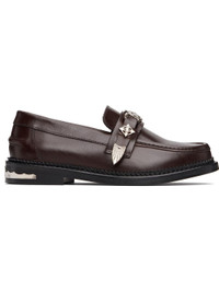 Buffed leather loafers. · Moc toe · Strap with graphic hardware at vamp · Pinched seam at heel counter · Engraved plaque at heel · Stacked leather heel with rubber injection · Leather sole Available exclusively at SSENSE. Supplier color: Chocolate brown Upper: leather. Sole: leather, rubber. Made in Portugal 252492F121019