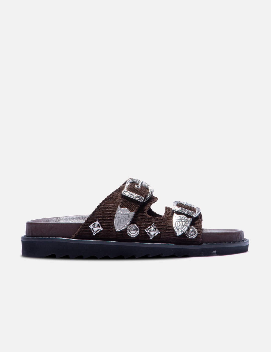 - Toga Pulla - Corduroy Sandal - Corduroy textile upper - Double strap with metal buckle closure - Leather insole - EVA outsole - Color: Brown - Material: Textile, Leather, EVA - See more Sandals and Shoes