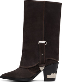 Mid-calf suede boots in brown. Detachable collar with pin-buckle and post-stud fastening. · Signature hardware throughout · Pointed toe · Graphic embroidered at vamp · Grained leather lining · Stacked leather heel with rubber injection · Polished leather sole · Heel: H3" Available exclusively at SSENSE. Supplier color: Chocolate brown