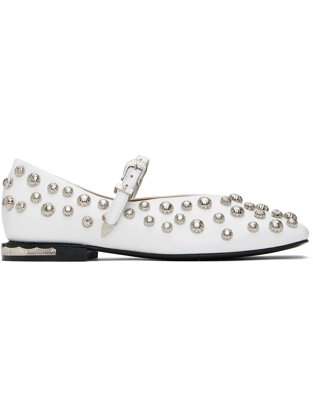 Polished leather Mary Jane-style ballerina flats in white. · Graphic studs throughout · Square toe · Pin-buckle strap at vamp · Buffed leather and suede lining · Plaque at stacked leather heel · Polished leather sole · Engraved silver-tone hardware Supplier color: White Leather. Made in Portugal 251492F118003