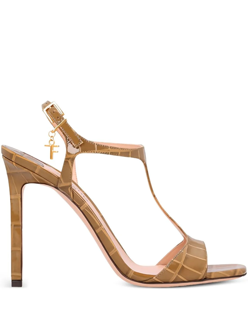 145mm Angelina T-bar crocodile-effect sandals Highlights - Beige - Crocodile-effect - Leather - T-bar design - Stiletto heel - Buckled ankle strap - Gold-tone charm Made in Italy Composition Lining: Calf Leather 100% Outer: Calf Leather 100% Sole: Calf Leather 100%