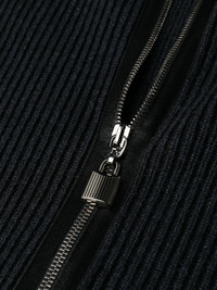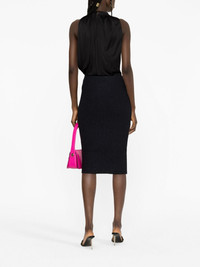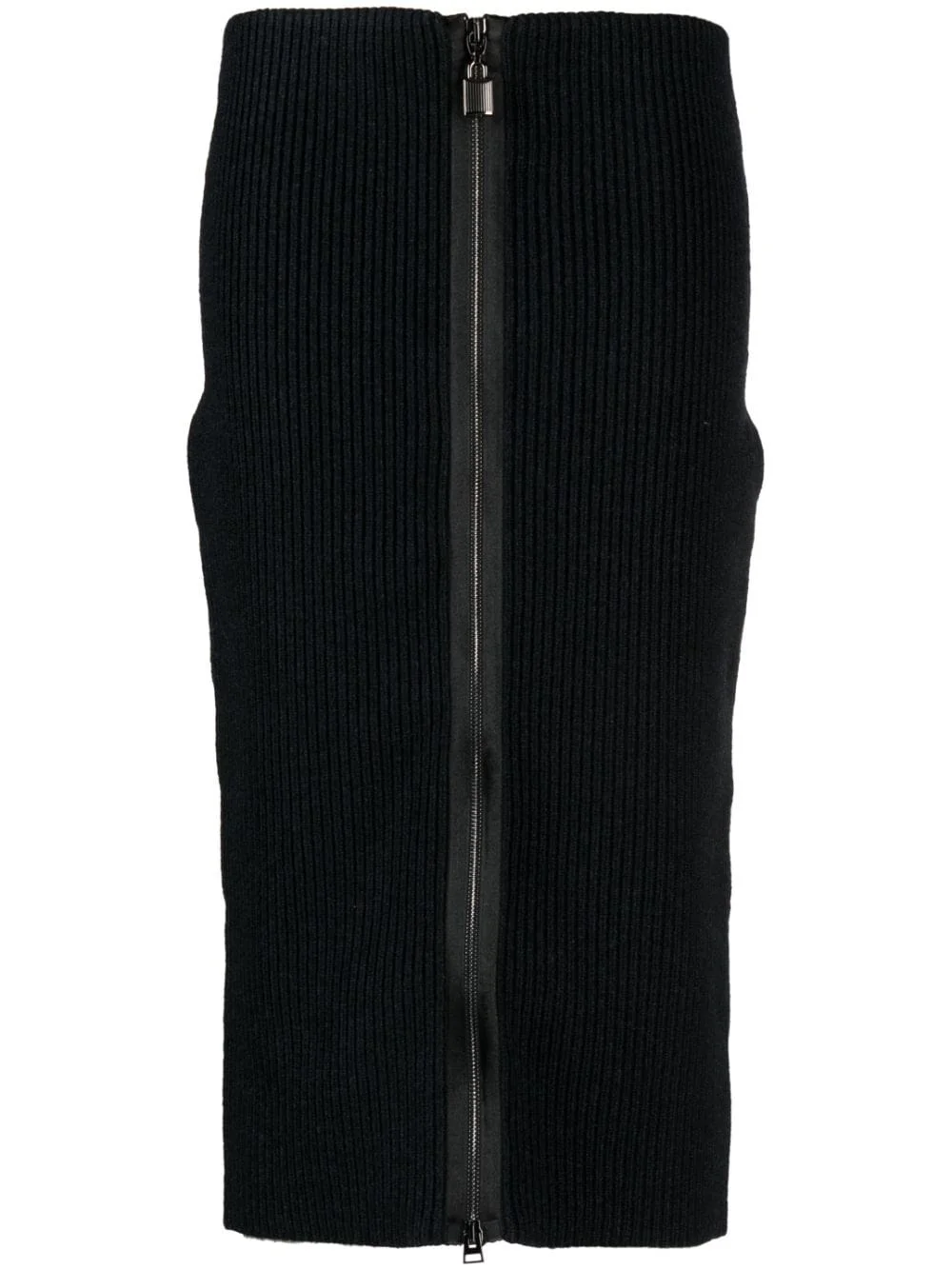 ribbed zip-up pencil skirt This black pencil skirt is elevated by signature detailing; the exposed front zip is fitted with a silver-tone padlock charm – a recurring emblem in TOM FORD collections. The ribbed design and satin trims add subtle textural contrast and visual interest. Highlights - Black - Wool-silk blend - Ribbed knit - High-waisted - Front zip fastening - Mid-length - Straight hem Made in Italy Composition Wool 55%, Silk 19%, Polyamide 14%, Polyester 9%, Spandex/Elastane 3% SIZE & FIT Model measurements Height 5 ft 10 in(1.79 m) Bust/Chest 31.1 in(79 cm) Hips 35.03 in(89 cm) Waist 24.01 in(61 cm) FittingInformation Made with a midweight knit, this piece offers some stretch This piece fits true to size – take your usual size