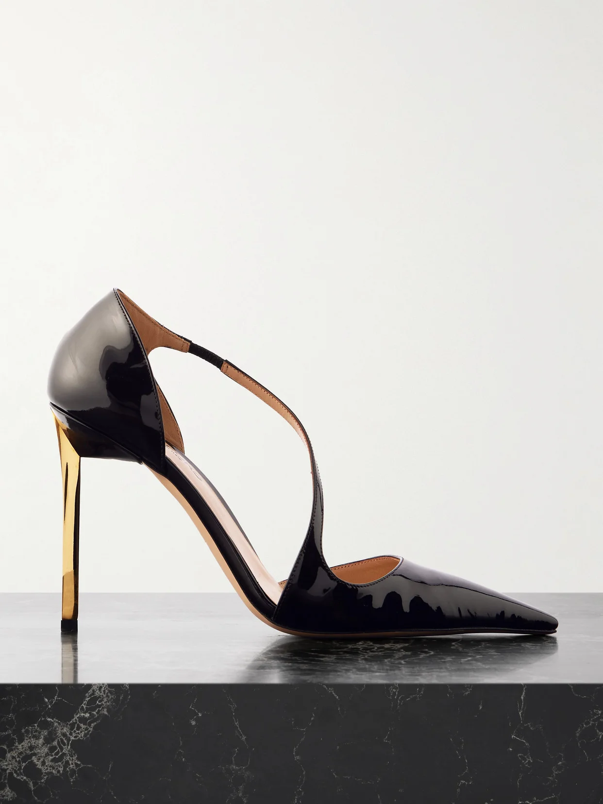 EXCLUSIVE AT NET-A-PORTER. TOM FORD's 'Newton' pumps have a slim elasticated strap that traces from the pointed toes to the ankle, comfortably cradling and framing your foot. They've been made in Italy from glossy patent-leather and are set on gold-tone metal 105mm heels.