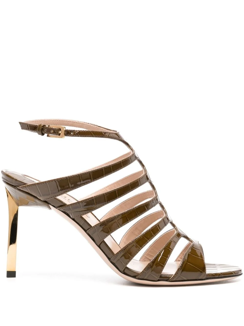 95mm caged leather sandals Highlights - Khaki - Calf leather - Patent finish - Embossed crocodile effect - Caged design - Buckle-fastening ankle strap - Logo-engraved buckle - Almond open toe - Branded leather insole - 95mm sculpted heel - Leather outsole Made in Italy Composition Lining: Calf Leather 100% Sole: Calf Leather 100% Outer: Calf Leather 100% SIZE & FIT Measurement CIRCUMFERENCE 8.66 in(22 cm) HEEL 3.74 in(9.5 cm) HEIGHT 2.75 in(7 cm) Sole height 0.39 in(1 cm)