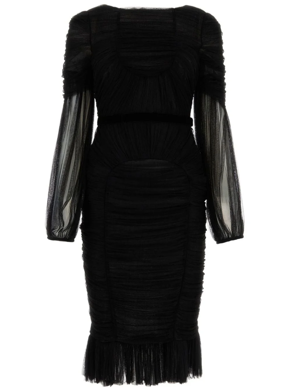 semi-sheer midi dress Highlights - Black - Silk blend - Semi-sheer panels - Draped design - Boat neck - Long sleeves - Ruffled detailing - Ruffle hem - Mid-length Made in Italy Composition Outer: Silk 84%, Nylon 16% Lining: Silk 84%, Nylon 16%