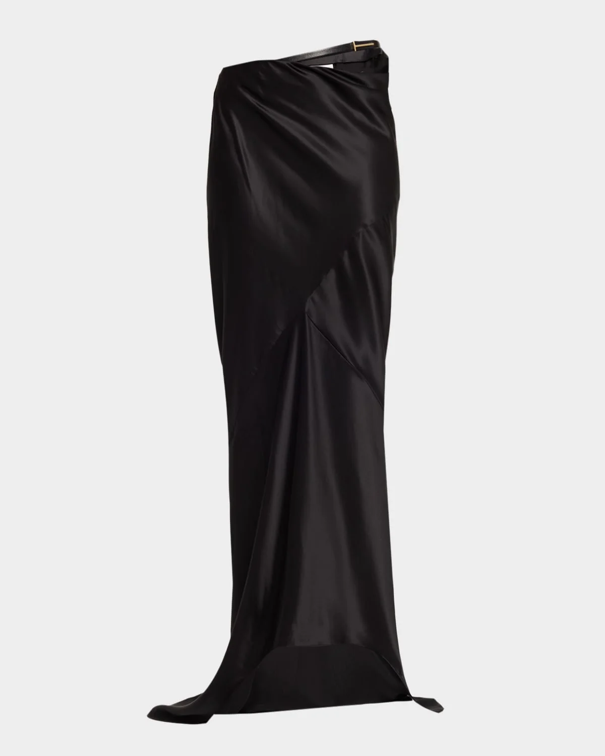 - TOM FORD bias satin skirt features a draped asymmetric waistline and gracefully flows to the grouns with a train - Low waist - Skirt falls straight from hip to hem - Floor sweeping hem - Side zip - Rayon/cellulose acetate/silk/nylon/polyamide - Made in Italy