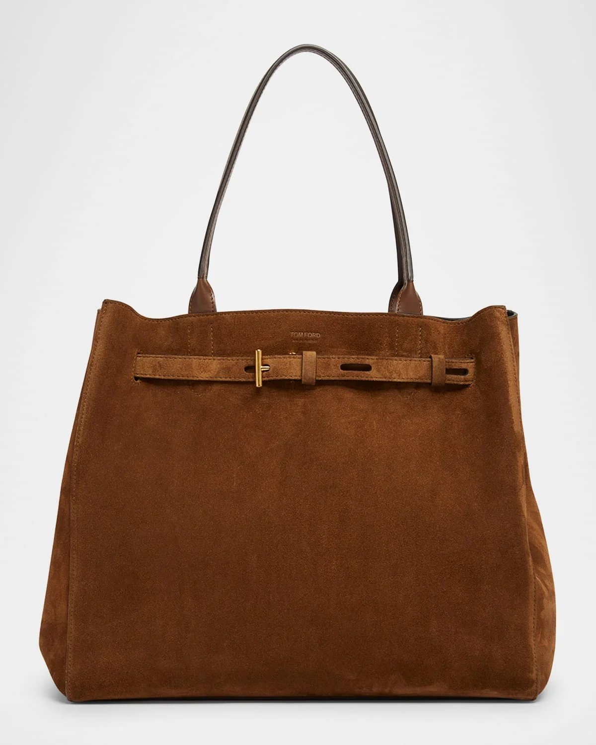 - Crafted in suede, the TOM FORD "Audrey" large tote bag is detailed with a woven belt strap, T bar buckle, and smooth calfskin leather trim - Leather shoulder straps - Open top - Interior, one zip pocket - Lining: Polyester - Trim: Leather - Approx. 12.2"H x 14.6"W x 7.7"D - Item Weight (Lbs.): 1.6 - Made in Italy