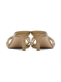 Croc-embossed patent goatskin mules in beige. · Open square toe · Logo hardware at vamp · Logo printed at buffed calfskin footbed · Kitten heel with rubber injection · Leather sole · Heel: H2.5" Supplier color: Safari beige