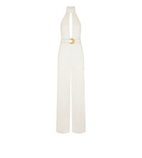 - HALTER NECK JUMPSUIT - FRONT CUT-OUT DETAIL - OPEN BACK - DETACHABLE LUNA BELT IN PATENT LEATHER - CENTRE BACK INVISIBLE ZIP - AMBER VINTAGE GOLD METAL HARDWARE - FULLY LINED - CRAFTED IN STRETCH SABLE' - 97% VISCOSE 3% ELASTANE