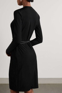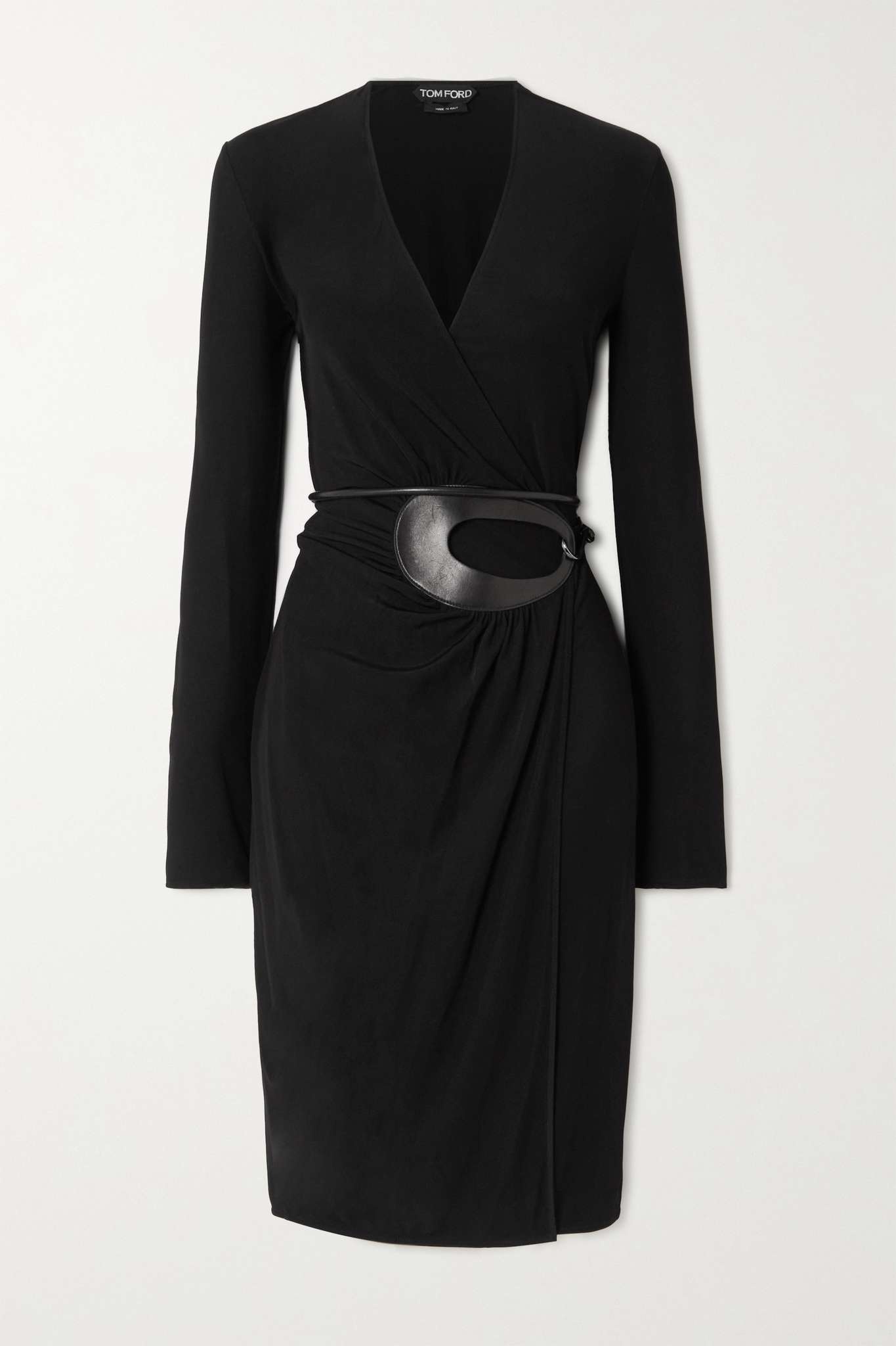 EDITORS'NOTES Channel the trend for easy elegance in TOM FORD's effortlessly chic dress. Made in Italy, it's cut from soft jersey in a timeless wrap silhouette and has a sculptural leather belt to cinch your waist. Complement the neckline with a fine gold chain. SIZE & FIT - Fits true to size, take your normal size - Wraparound design, fastens at the waist - Mid-weight, slightly stretchy fabric - Model is 180cm/ 5’11” and is wearing an IT 40 DETAILS & CARE - Black jersey - Hook fastening at side - 78% viscose, 14% polyamide, 8% elastane; trim: leather (Lamb) - Dry clean