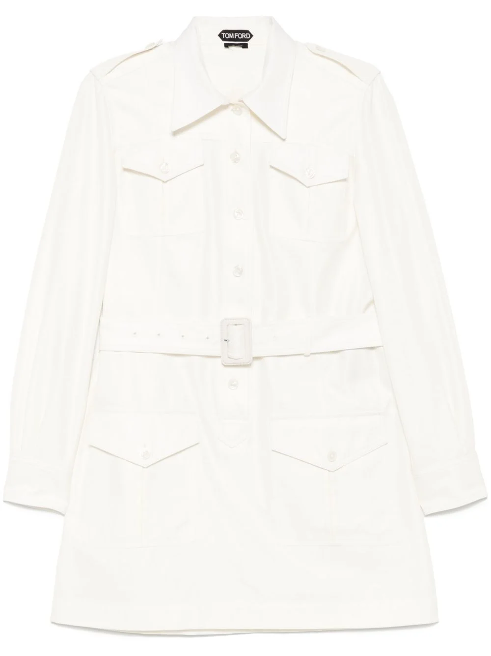 belted shirt mini dress Highlights - White - Front button fastening - Front buckle fastening - Buttoned cuffs - Four front flap pockets Made in Italy Composition Bos Taurus 100%, Cotton 66%, Silk 34% SIZE & FIT Model measurements Height 5 ft 11 in(1.8 m) Bust/Chest 32.67 in(83 cm) Hips 36.22 in(92 cm) Waist 24.4 in(62 cm) FittingInformation Designed for a slim fit that sits just away from the body offering a close yet comfortable fit The belt offers adjustability for fitted preferences Made from a midweight non-stretch fabric