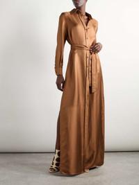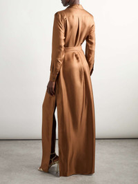EDITORS'NOTES There's such an ease and sophistication to TOM FORD's dress, which moves beautifully thanks to its thigh-high slits. It's cut from silk-twill which has a gorgeous sheen and cinches at the waist with the coordinating belt. Wear yours with stilettos for extra impact. SIZE & FIT Model measurements: - Fits true to size, take your normal size - Designed for a loose fit, use the belt to cinch in at the waist - Lightweight, fluid, non-stretchy fabric - Model is 177cm/ 5'10" and is wearing an IT38 - Bust: 79cm/ 31" - Waist: 61cm/ 24" - Hip: 89cm/ 35" DETAILS & CARE - Camel silk-twill - Button fastenings - 100% silk - Dry clean