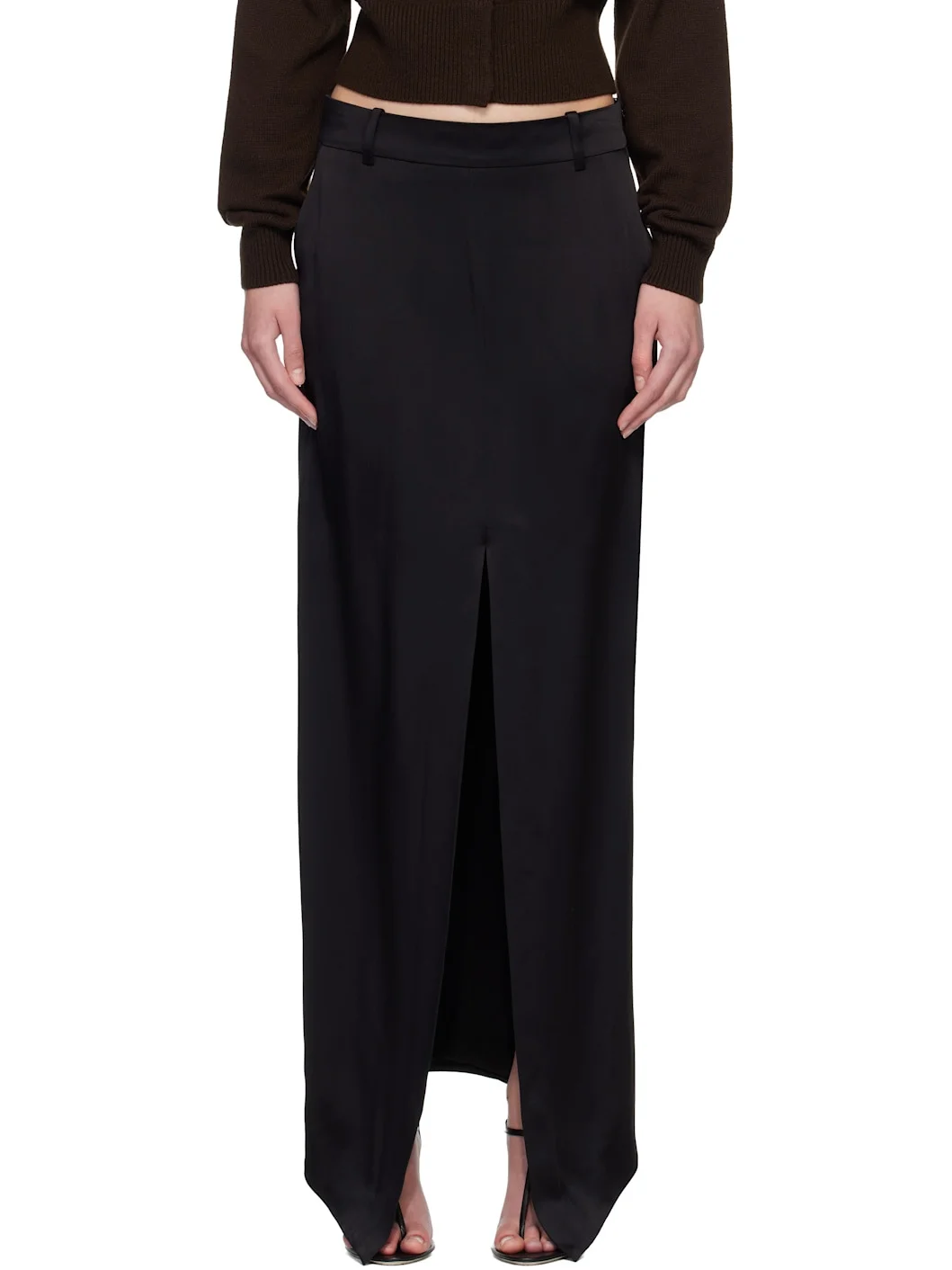 Crepe satin maxi skirt. · Belt loops · Four-pocket styling · Central slit at front hem · Concealed zip closure at side · Full silk crepe satin lining Supplier color: Black Body: 73% acetate, 27% viscose. Lining: 100% silk. Made in Italy 261076F093000