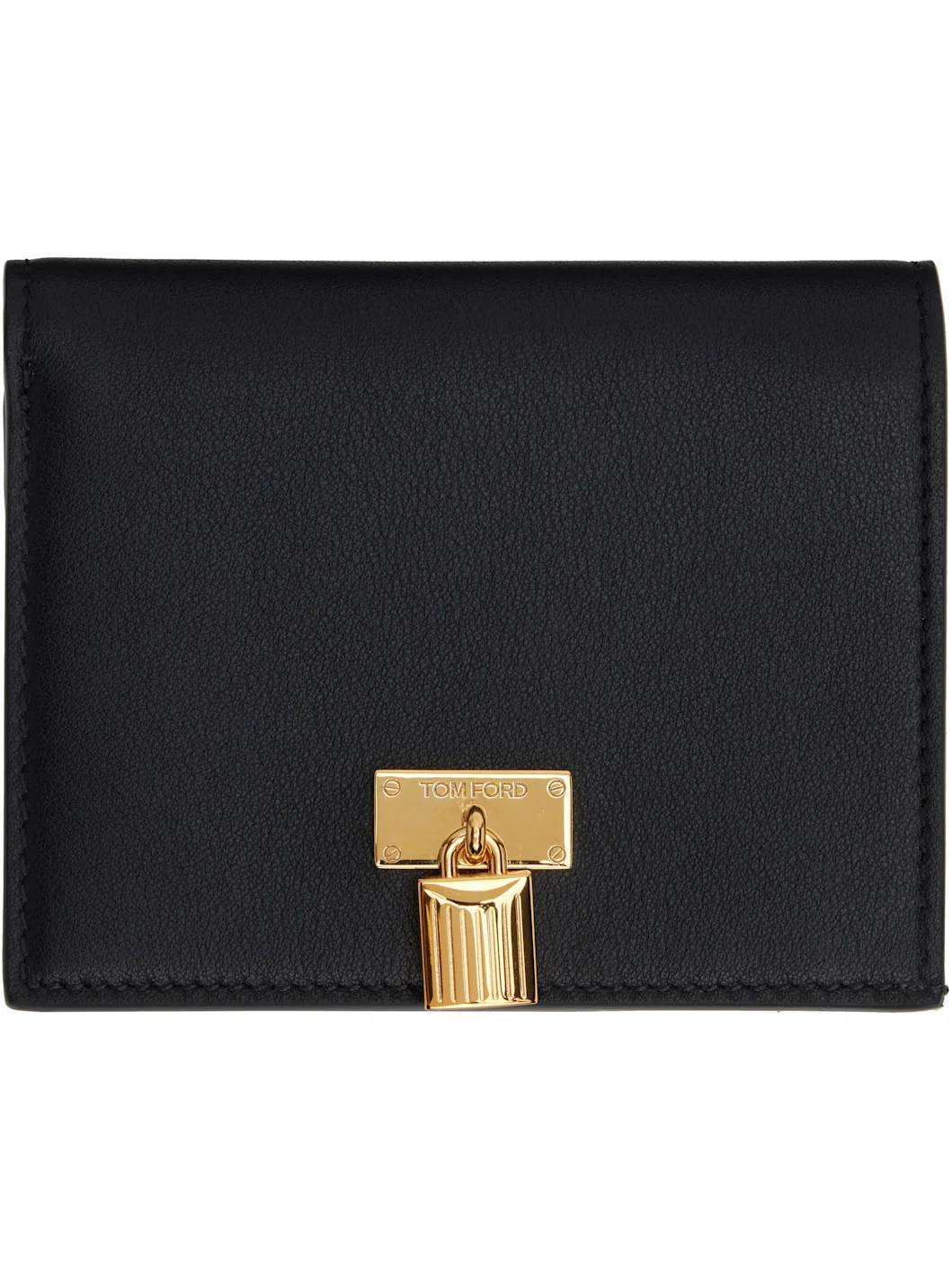 Grained calfskin bifold wallet. · Padlock charm and logo plaque at face · Press-stud closure · Five card slots at sheepskin interior · Coin pouch · Moire lining · Gold-tone hardware · H3.5" x W4" x D1" Supplier color: Black Calfskin. Made in Italy 252076F040000
