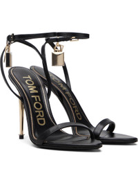 Buffed goatskin heeled sandals. · Open pointed toe · Padlock and key charm at pin-buckle ankle strap · Logo printed at leather footbed · Metal stiletto heel with rubber injection · Polished leather sole · Logo-engraved gold-tone hardware · Heel: H4" Supplier color: Black Upper: leather. Sole: leather. Made in Italy 261076F125011