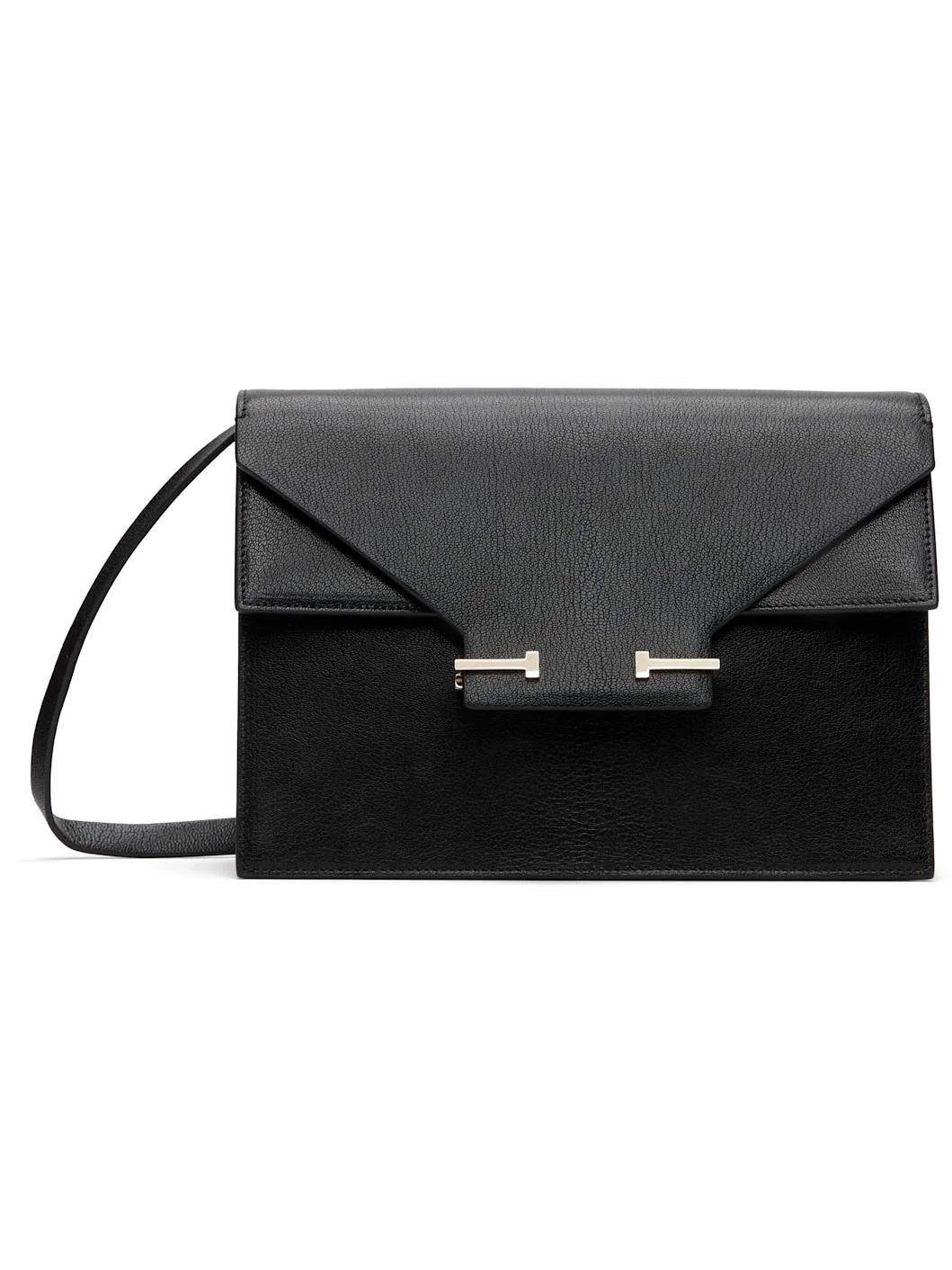 Grained goatskin shoulder bag. · Adjustable and detachable crossbody strap · Logo hardware and concealed flap pocket at face · Accordion panel at sides · Logo stamp at back face · Press-release flap · Patch pocket and card slot at interior · H7.5" x W10" x D4" Supplier color: Black Goatskin. Made in Italy 261076F048005