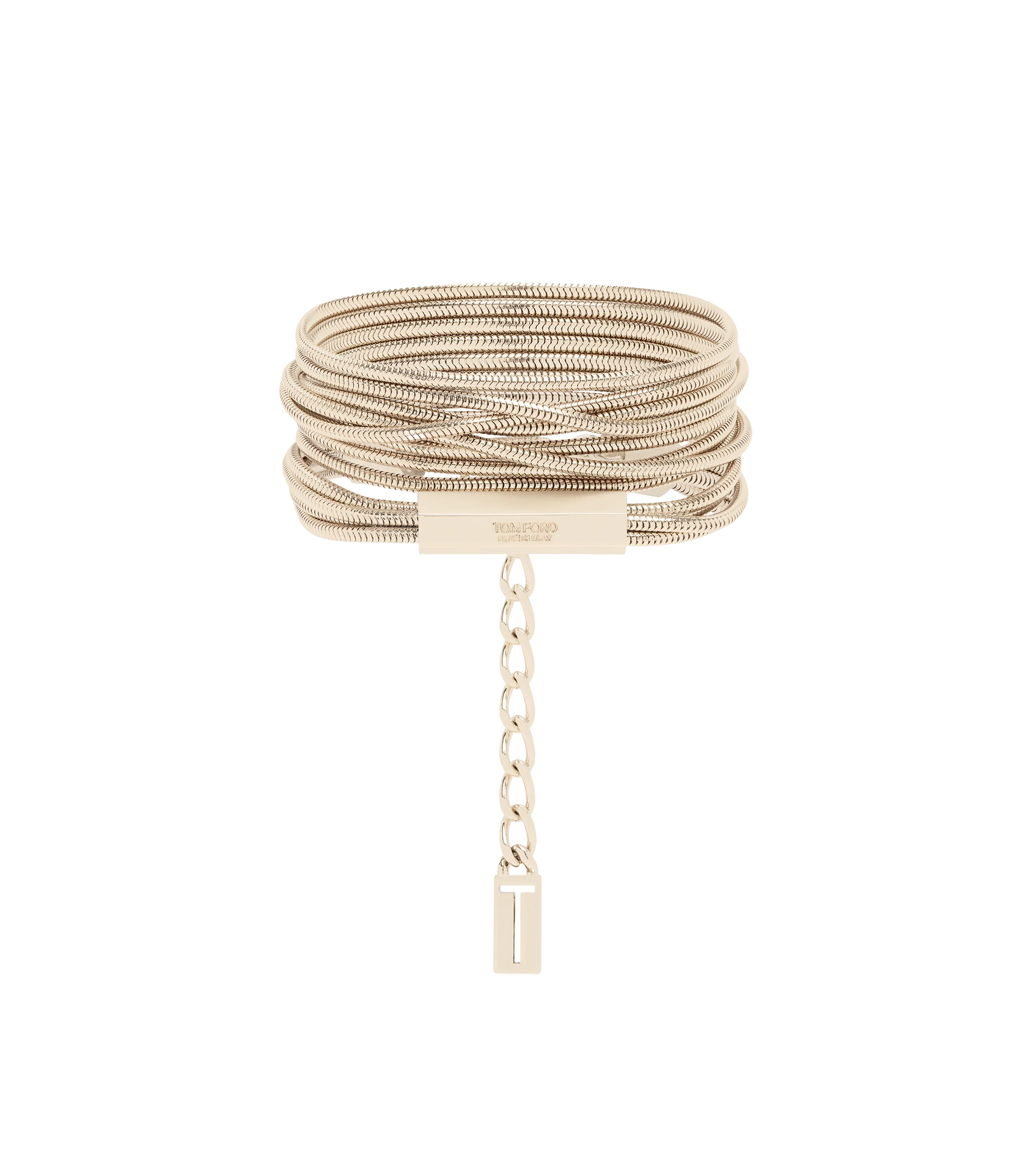 - TRIPLE-WRAP TUBULAR SNAKE CHAIN ADORNED WITH HEXAGONAL DETAIL - ADJUSTABLE LOBSTER CLASP - RECTANGULAR PLATE WITH T-SHAPED CUTOUT - ENGRAVED LOGO - 100% BRASS - NICKEL FREE - ONE SIZE - MADE IN ITALY