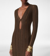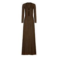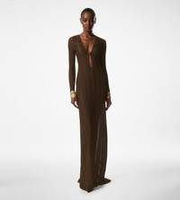 - LONG SLEEVE KNITTED EVENING DRESS - FULL LENGTH - DEEP V-NECK WITH FRONT TEARDROP OPENING - CRAFTED IN TUCK STITCH LUREX - GAUGE 14 - 57% VISCOSE 28% POLYESTER 15% METALLIC FIBER