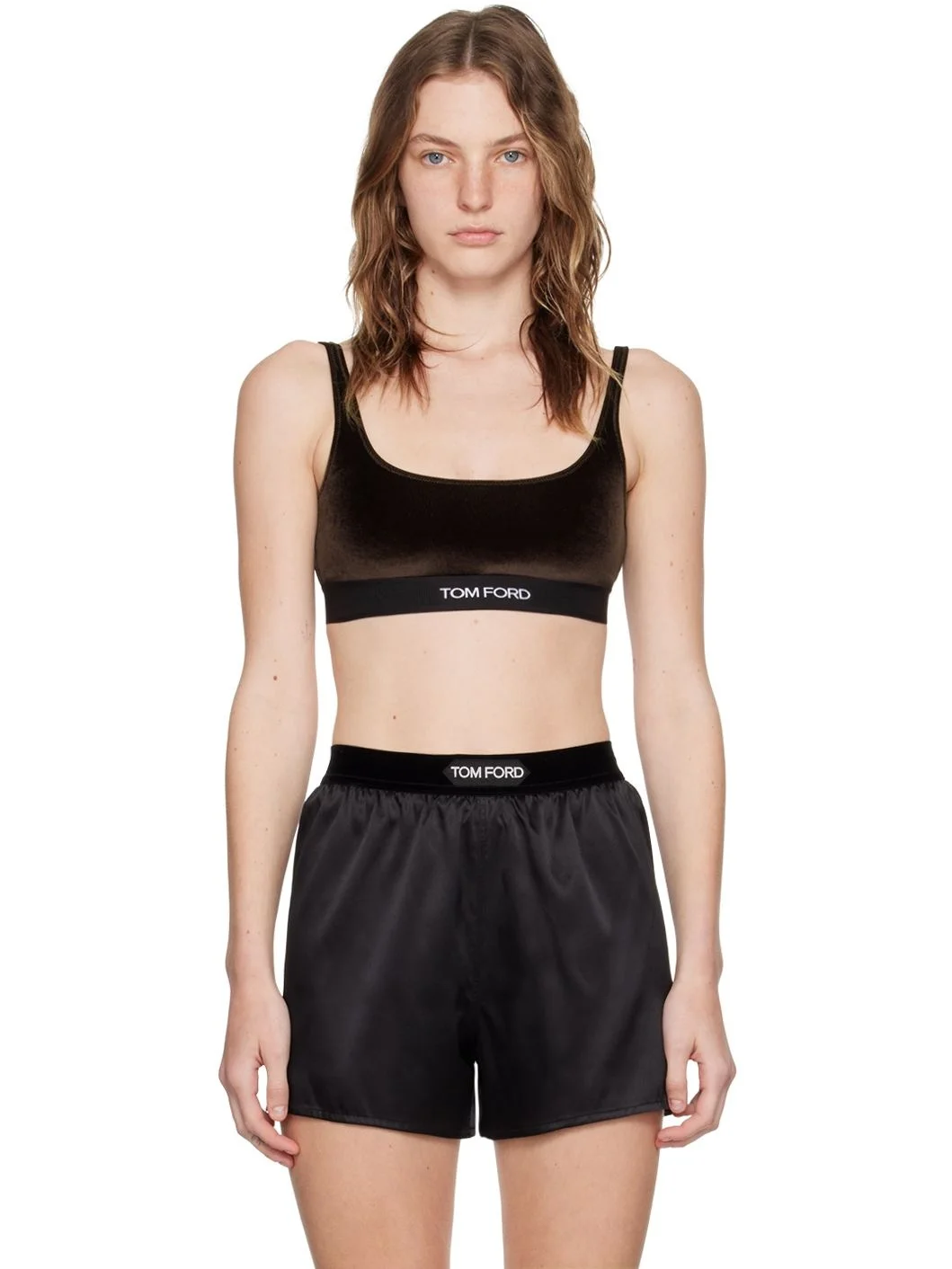 Triacetate- and polyester-blend velour bra. · Scoop neck · Jacquard logo elasticized hem · Fixed shoulder straps · Full stretch mesh lining Supplier color: Choco brown Body: 72% triacetate, 28% polyester. Trim: 82% polyester, 9% elastane, 9% polyamide. Lining: 82% polyamide, 18% elastane. Made in Bosnia And Herzegowina 242076F073000