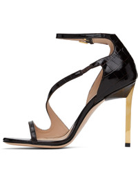 Croc-embossed patent calfskin heeled sandals in brown. · Open toe · Partially elasticized strap at vamp · Pin-buckle ankle strap · Logo-printed buffed leather and suede footbed · Metal stiletto heel with rubber injection · Polished leather sole · Heel: H4" Supplier color: Espresso Upper: calfskin. Sole: leather. Made in Italy 242076F125020