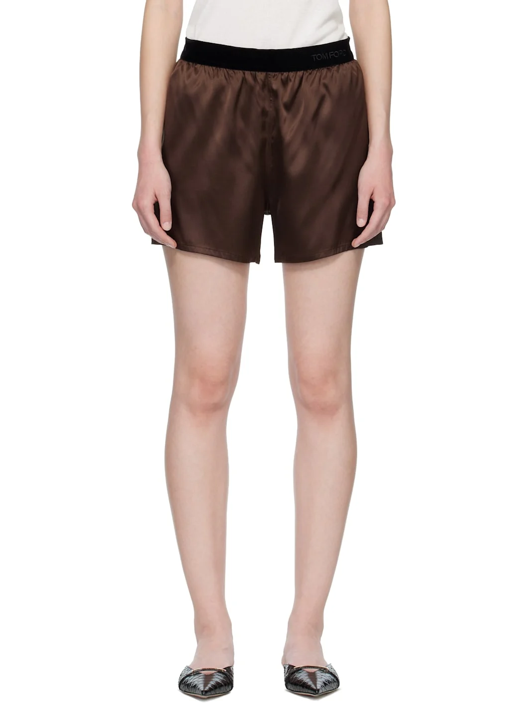 Stretch silk satin shorts. · Logo embroidered at elasticized velour waistband · Vented cuffs Supplier color: Cinnamon Body: 94% silk, 6% elastane. Trim: 90% nylon, 10% elastane. Made in Italy 261076F088002